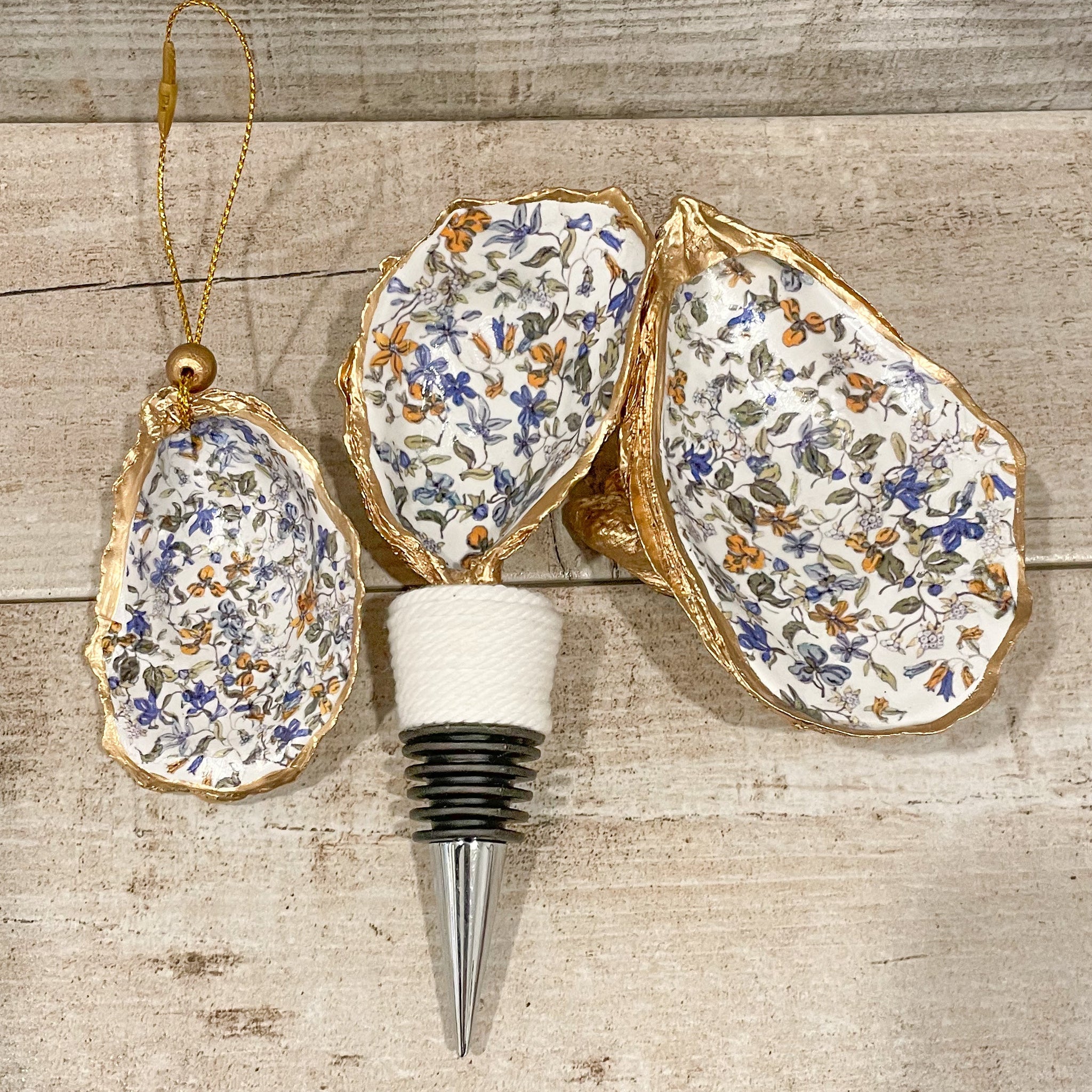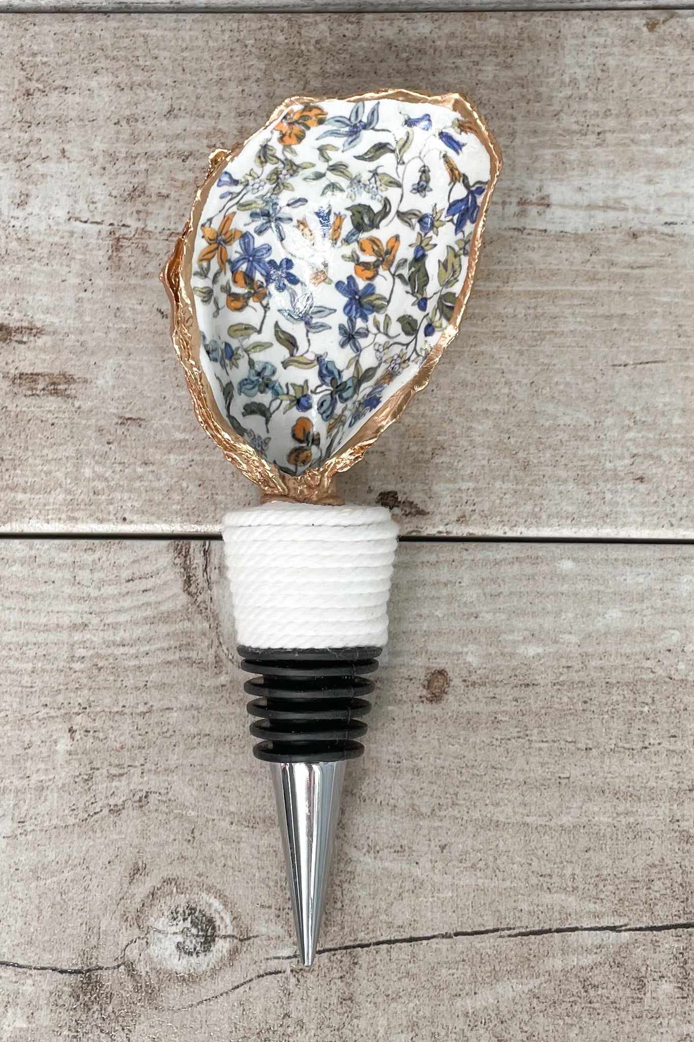 Each bottle stopper is hand wrapped and topped with a hand embellished, locally sourced oyster shell. The white cord is sprayed with Scotch Guard to prevent getting dirty from fingers taking the stopper in and out of a bottle. Every oyster shell is unique so each one will vary.